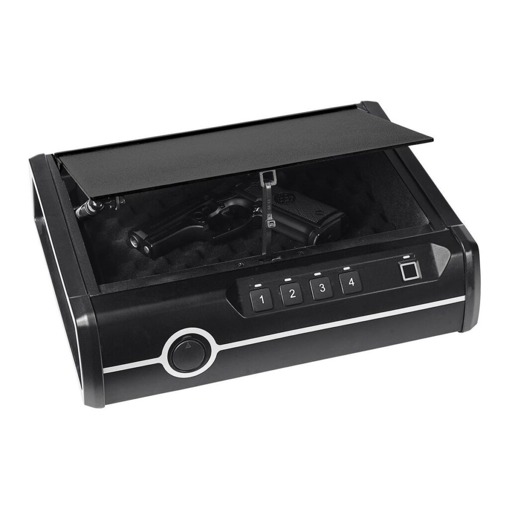 Esta confiable caja fuerte para armas utiliza entrada biométrica de huellas dactilares para garantizar un acceso seguro, discreto y con una sola mano. El puntal de compresión de gas proporciona una apertura sin complicaciones para un acceso rápido . La caja tiene capacidad de almacenamiento  para 2 pistolas estándar o 1 grande.