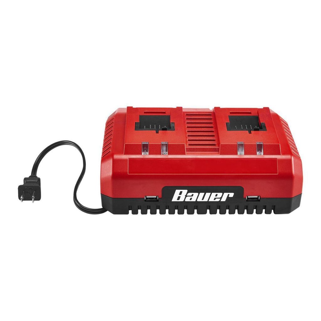 El cargador de doble puerto Bauer ™ es capaz de cargar dos baterías de 20 V simultáneamente por menos tiempo de inactividad. Los puertos USB duales son perfectos para cargar teléfonos celulares, tabletas y pequeños dispositivos electrónicos. La carcasa tiene agujeros de montaje integrados para la instalación permanente en su tienda o garaje.