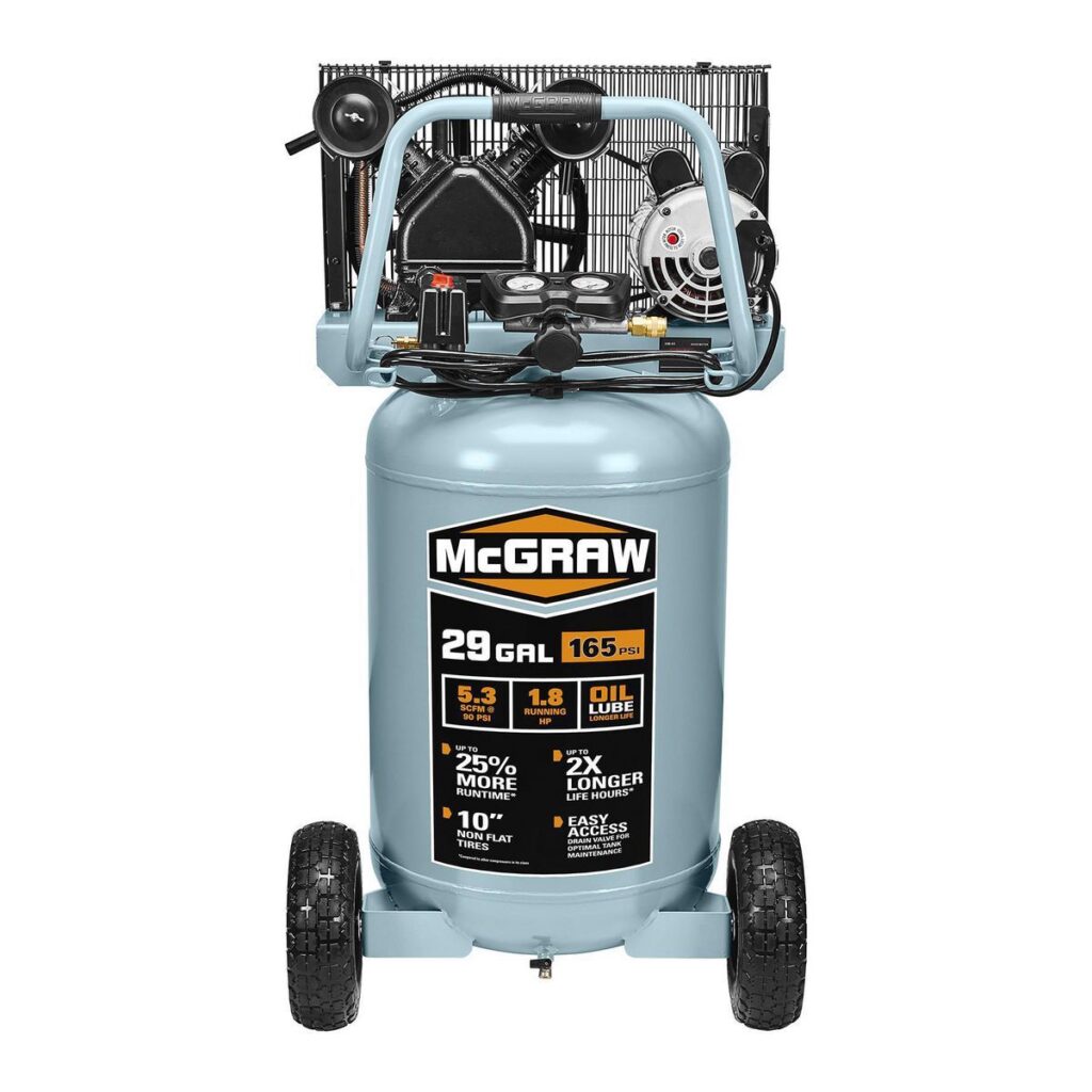 Este compresor de aire vertical con lubricación de aceite MCGRAW® de 29 galones y 165 PSI es ideal para uso intermedio a continuo de herramientas neumáticas, clavado/grapado, pintura, pistolas de soplado y otras aplicaciones neumáticas. El potente motor de inducción de 1,8 HP está equipado con condensadores de arranque y funcionamiento para un funcionamiento confiable. Este compresor de aire también incluye filtros de entrada de aire metálicos para ayudar a limpiar el aire y reducir el ruido.