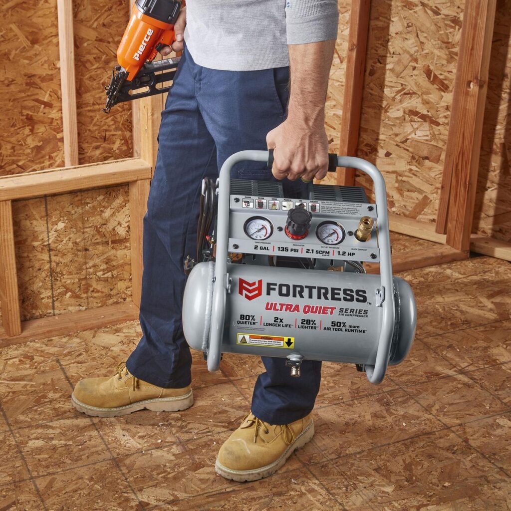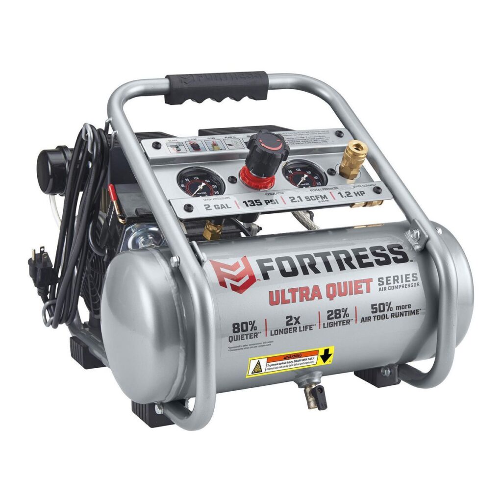 Este compresor portatil de aire supersilencioso de la serie FORTRESS® ULTRA QUIET es un 80% más silencioso y hasta un 28% más liviano que otros compresores de su clase. Este compresor de aire de calidad profesional ofrece hasta un 50 % más de tiempo de funcionamiento que compresores similares para el lugar de trabajo. El compresor tiene un panel de control integrado con medidores fáciles de leer y DOS acopladores de conexión rápida incorporados para una fácil conexión de manguera con una sola mano.