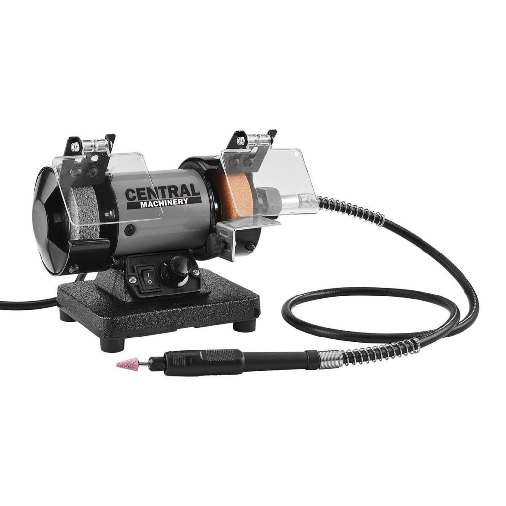 Esta amoladora de banco compacta no ocupará mucho espacio en su taller. El eje flexible de alta velocidad funciona a 11.000 RPM para desbarbar, esmerilar y pulir piezas pequeñas.