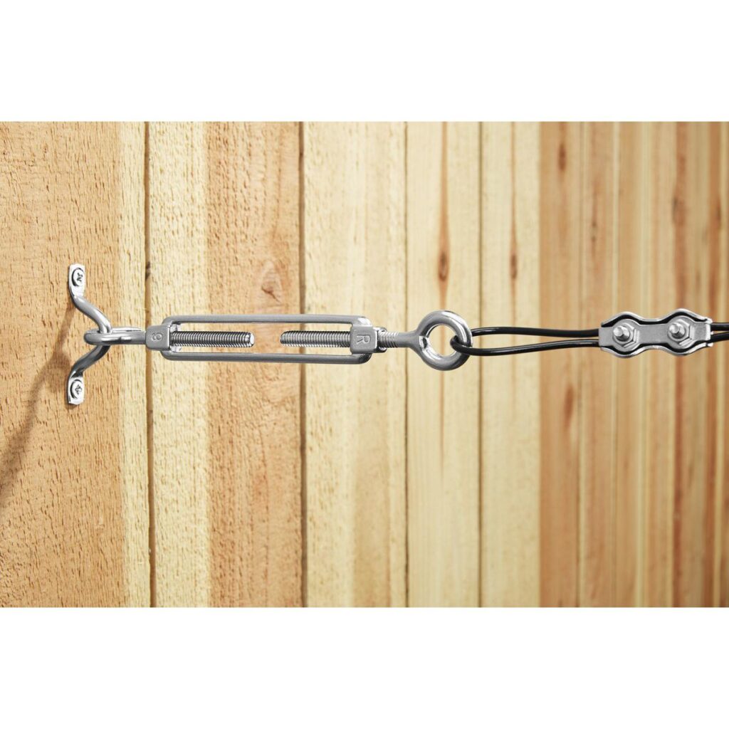 El kit incluye cable, bridas, tensor, soportes de pared, abrazaderas para cuerda, tornillos para madera y una llave.