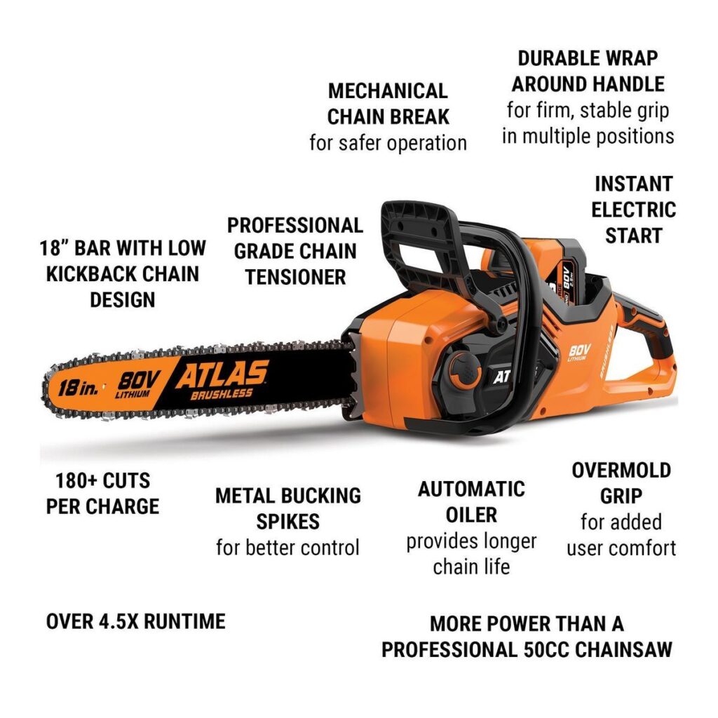 La motosierra inalámbrica sin escobillas de 18 pulgadas ATLAS™ de 80 V tiene un motor sin escobillas de larga duración para brindar la cantidad adecuada de rendimiento y eficiencia. La plataforma de batería ATLAS™ ofrece 4 veces más potencia* y 4,5 veces más cortes por carga** sin combustible, sin humos, sin mantenimiento del motor y con un arranque instantáneo. Corte ramas y troncos de hasta 32 pulgadas de forma fácil y segura con las púas integradas y el freno de cadena mecánico. Utiliza únicamente baterías ATLAS™ de 80 V, que se venden por separado.