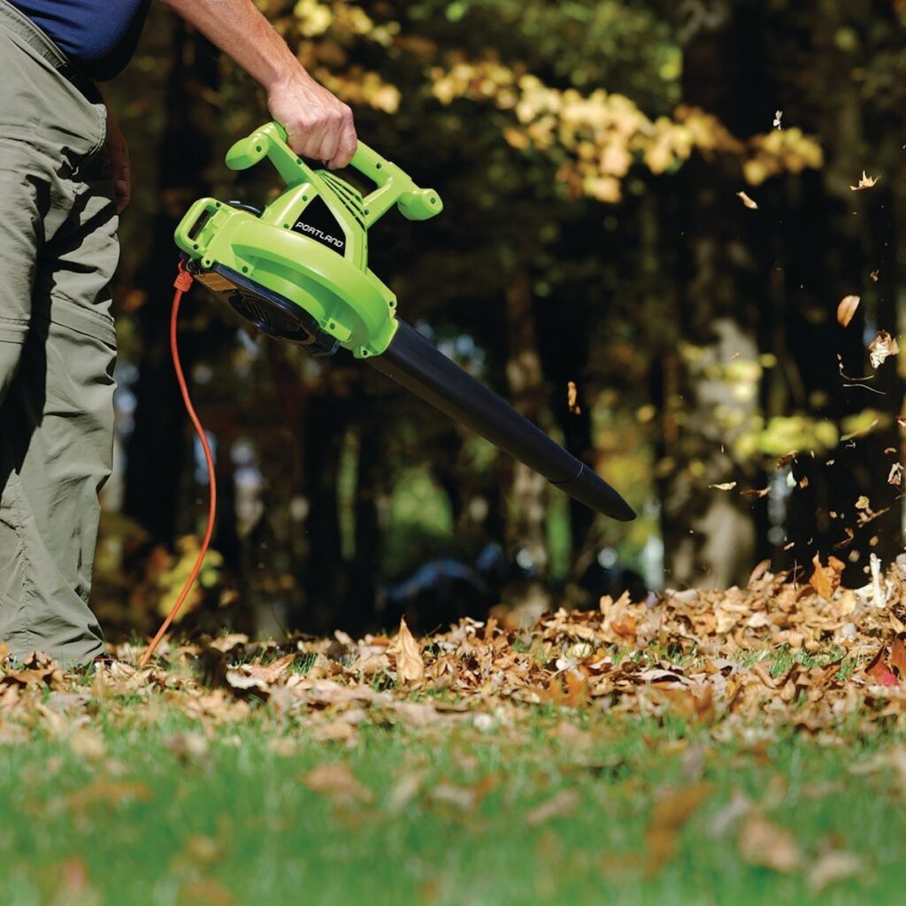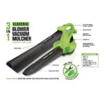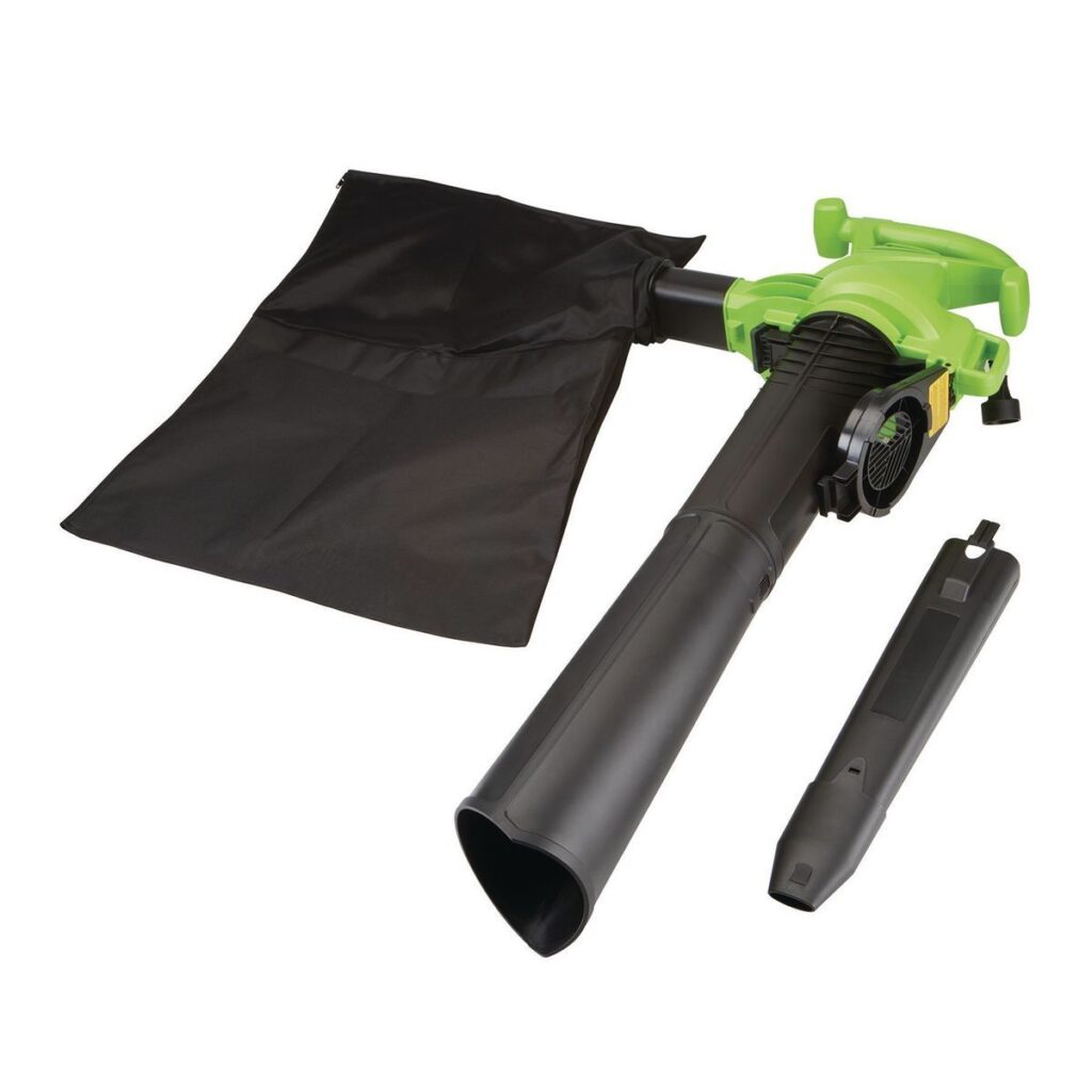 Este soplador de hojas eficiente y liviano se convierte en aspiradora con solo presionar un interruptor. El soplador de hojas eléctrico tiene un modo de aspiración para capturar las hojas, triturarlas y embolsarlas como mantillo.