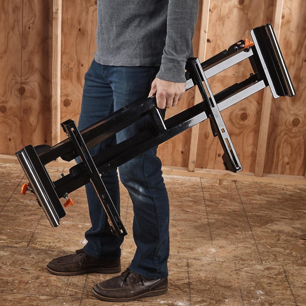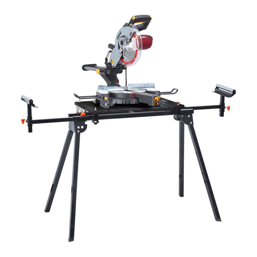 Este soporte plegable para sierra ingletadora es compatible con la mayoría de las sierras ingletadoras de 10 pulgadas. Los brazos extensibles soportan más de 80 pulgadas de material y hasta 350 lb. Con una construcción de acero duradera que proporciona un soporte resistente y nivelado mientras trabaja.